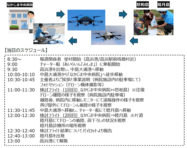 物流拠点となる「なかじま中央病院」に荷物を集荷し、船による配送の代わりにドローンを使用して怒和島および睦月島への配送実験を行う。