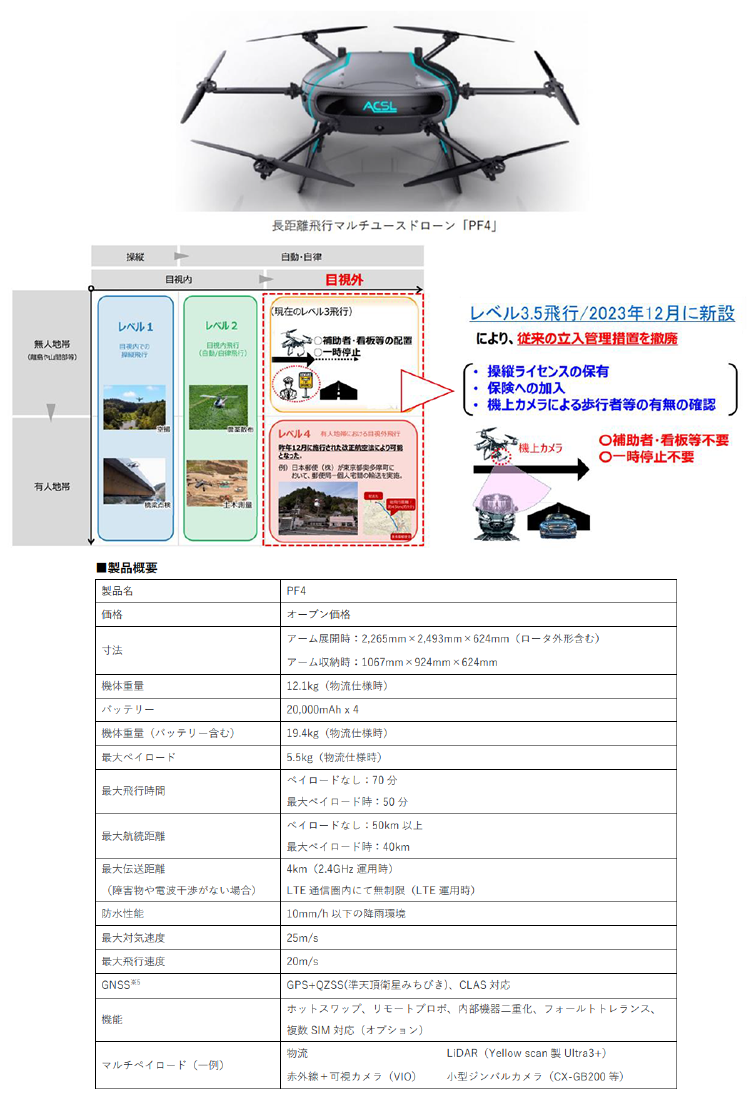 株式会社ACSL製マルチユースドローン「PF4」は、産業分野における既存業務の省人化、無人化を実現すべく開発された機体で、最大5kgの荷物を最大約40km先まで輸送可能な物流用途に特化した最新の物流専用ドローン